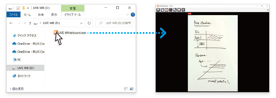 USBケーブルを接続すると、パソコンに新しいドライブ「LIVE WB」が表示されます。 「LIVE WB」ドライブを開き、「LIVE Whiteboard.exe」をダブルクリックして起動します。 ホワイトボードの板書データがリアルタイムに表示されます。