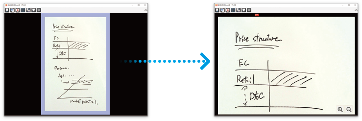 ズームボタン[+]または[−]、またはマウスホイールのスクロールで拡大率を変更することができます。 板書データをドラッグすることで表示エリアを移動することができます。 拡大表示を終了するには再度拡大表示ボタンをクリックします。