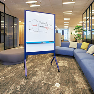 オフィスの中を“歩く”ように移動できる、軽やかなホワイトボード。「ALKU(アルク)」は、パーティションとして空間を仕切りながら、ホワイトボードとしての書きやすさと、どこへでも動かせる機動性を兼ね備えた、新しいワークスタイルのためのツールです。さらに新モデルでは、ブラックフレームタイプに「アクセントカラー付きトレイ(4色)」を追加。空間に彩りと個性をプラスできます。