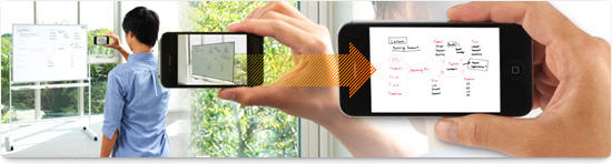 「パシャボ」はスマートフォンでの撮影に最適化されたホワイトボード。無料の専用アプリでパシャ!と撮るだけで見やすく軽い画像データ(JPEG)に変換できます。
